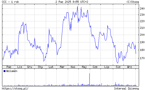 Удовлетворение президента и его вера в развитие компании по утрам не шли рука об руку с хорошим настроением инвесторов. Курс очень сильно упал. В то время как вчера днем он был заплачен за одну долю CCC выше PLN 186, сегодня утром счетчик получил на 10 PLN меньше. Для некоторых ситуация с августа, вероятно, напомнила, когда предварительные результаты были представлены за второй квартал. Затем цитаты сделали сбой, о котором вы можете прочитать больше в этом тексте.