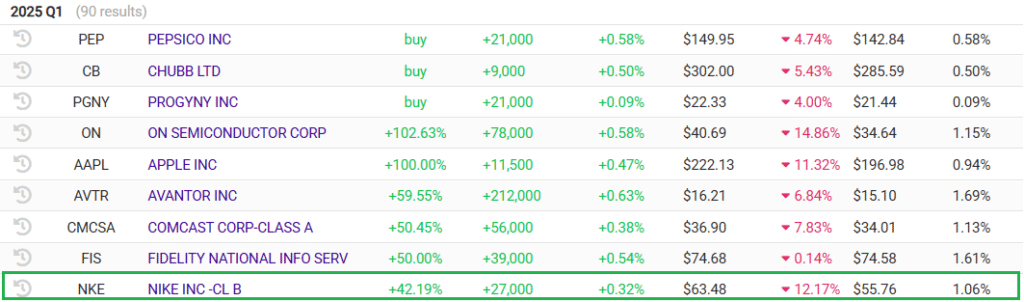 Роберт Олштейн, который управляет активами на сумму более 540 миллионов долларов, также увеличил свои позиции на Nike. Фонд увеличил предметы до 1,06 % своего портфеля.