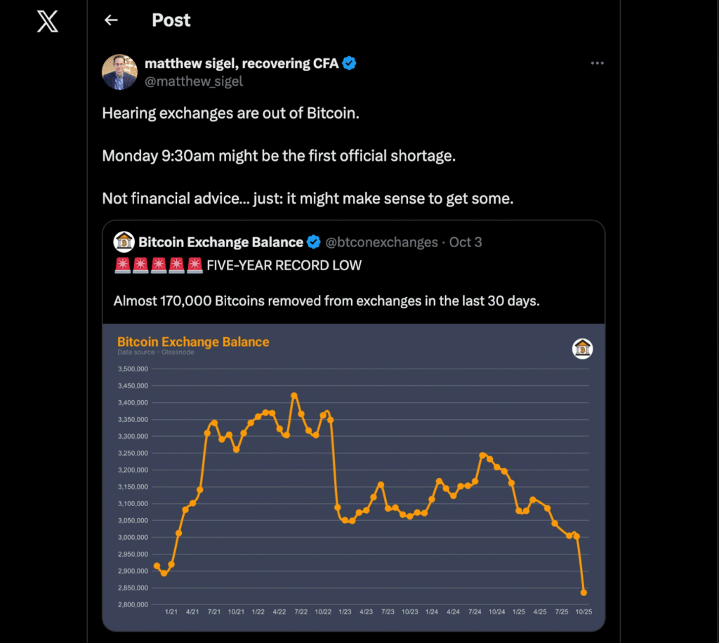 Мэтью Сигел из Vaneck предупредил фондовые биржи, что вскоре они могут закончить резервы биткойнов. Это описывается как потенциальный «дефицит».