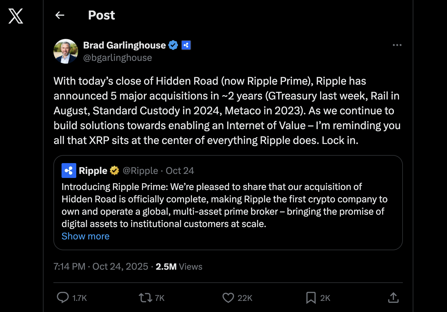 Бычий рынок XRP стимулируется новой институциональной стратегией Ripple, которая только что сделала большой шаг вперед с приобретением компанией Hidden Road, теперь переименованной в Ripple Prime.