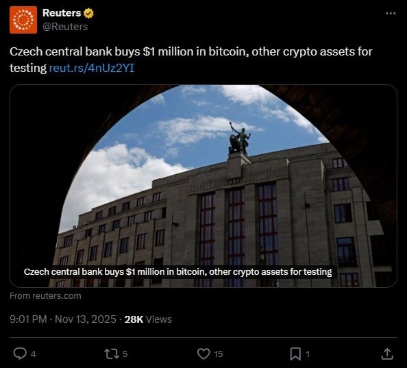 Чехия переходит на криптовалюты. Центральный банк потратил $1 миллион на BTC и другие токены