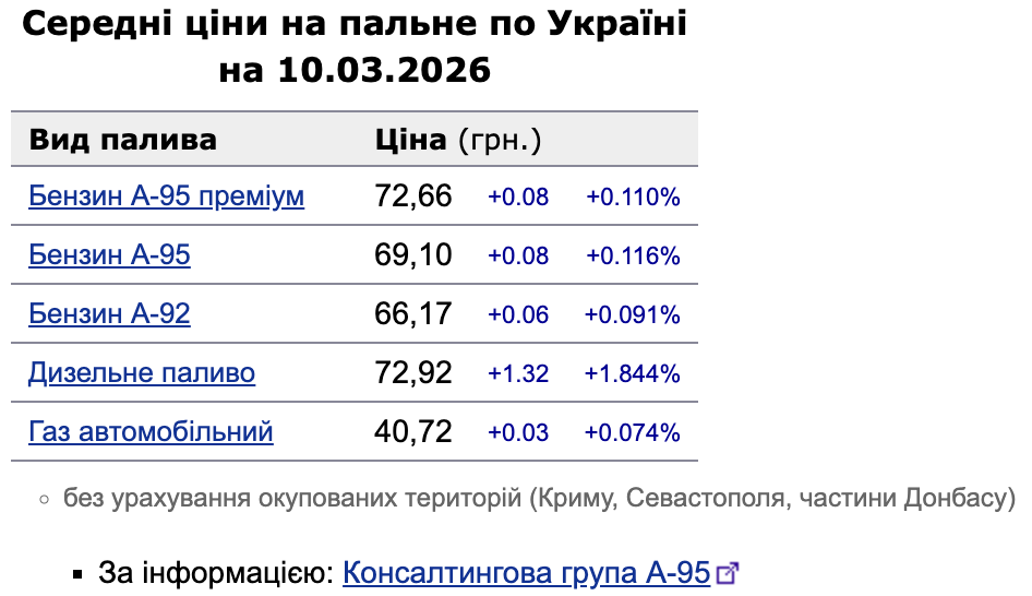 - Бензин А-95 (премиум) подорожал на 8 копеек — до 72,66 грн/л.