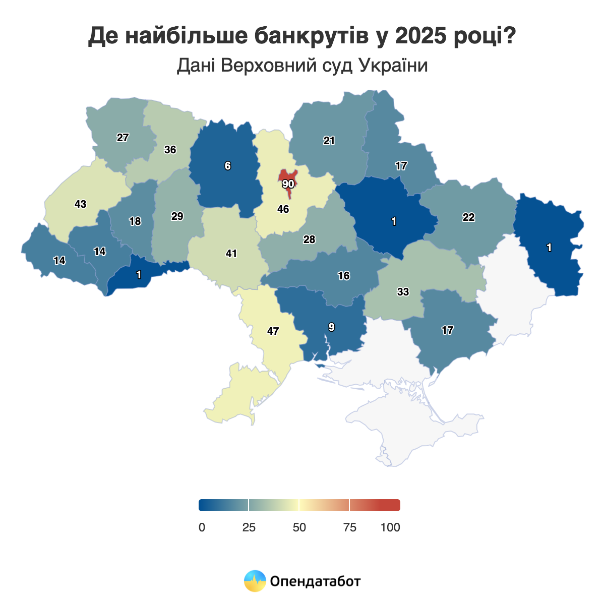 Банкротство в 2025 году было открыто в Киеве — 128. Во втором месте в регионе Киева с 83 случаями, подражая Лвива, где было подано 73 заявления.