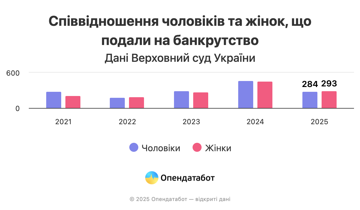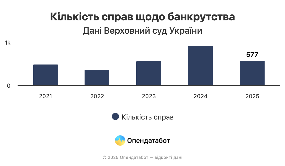 577 украинцев стали банкротами в течение полугода 2025 года в Украине. Такие случаи увеличились на 33% по сравнению с тем же периодом в 2024 году. В целом, большинство людей стали банкротами в прошлом году: 926 случаев, однако текущий год рискует догнать эти показатели. Это указано в данных OpenAtable.