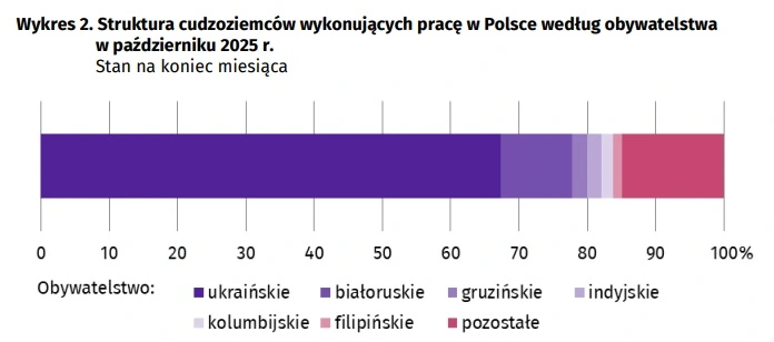 По состоянию на 31 октября 2025 года их было 767,1 тыс., то есть на 7,3% больше, чем за тот же период годом ранее. Граждане этой страны составляют целых 67,3% от общего числа иностранцев, работающих в Польше. Большинство работающих иностранцев проживают в Варшавском столичном регионе (20,2%).
