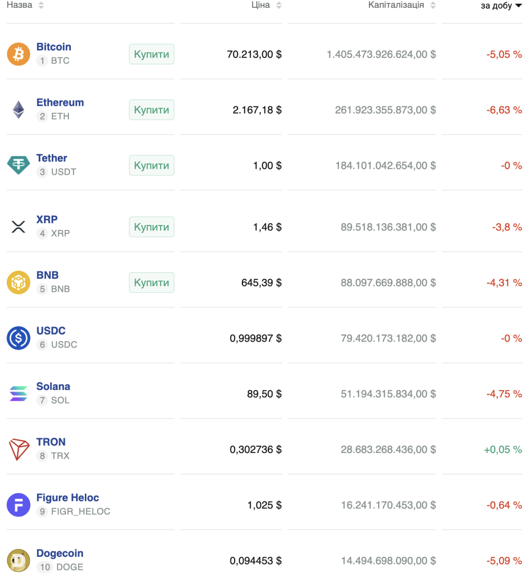 На момент написания новости биткоин опустился до $70 213. За последние сутки актив снизился на 5%.