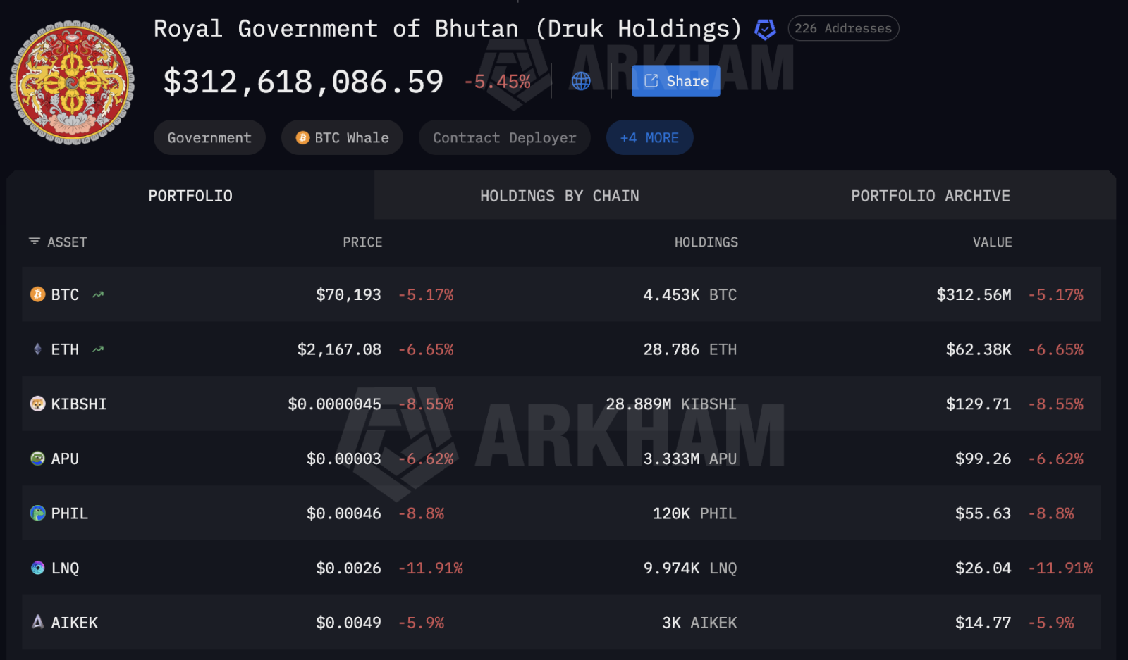 На пике своего криптоинвестиционного пути (в октябре прошлого года) Бутан владел более 13 000 BTC. Сейчас же в распоряжении фонда осталось лишь 4 453 BTC (более $312 млн), что в три раза меньше максимальных показателей.