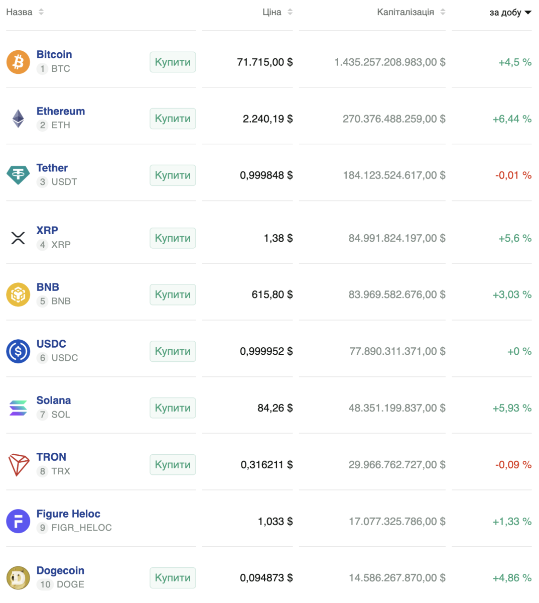 К моменту написания новости актив несколько откатился назад и торгуется на уровне $71 715. За сутки первая криптовалюта подорожала на 4,5%. Другие криптовалюты с наибольшей капитализацией также оказались в «зеленой зоне». При этом наибольший рост за последние 24 часа продемонстрировал Ethereum (+6,44%).
