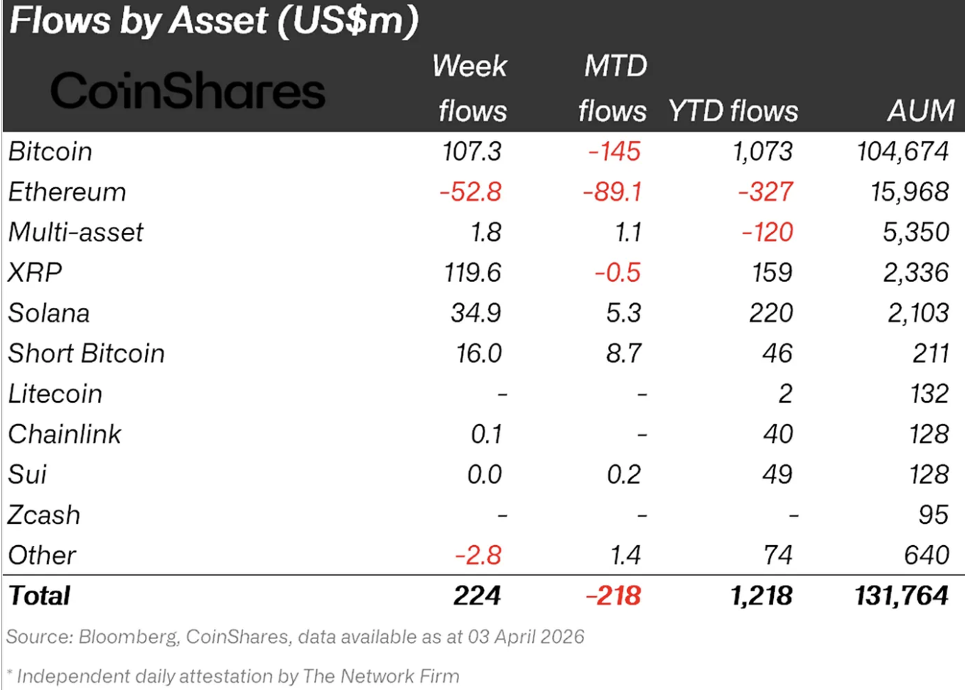 После периода неуверенности на рынке криптовалютных инвестиционных продуктов наблюдается умеренное восстановление. По данным недельного отчета CoinShares, в период с 30 марта по 3 апреля приток капитала составил $224 млн, что позволило общему объему активов в управлении (AuM) возрасти до $131 млрд.