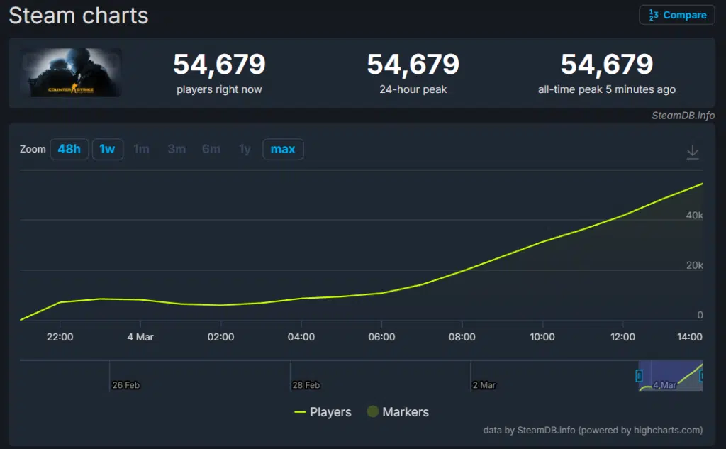 Как видите, игроки очень скучают по CS:GO. На данный момент, по данным SteamDB.info, в игре более 54 000 игроков. Это почти в два раза больше, чем в таких играх, как Cyberpunk 2077 или Red Dead Redemption 2. Можно предположить, что если бы Valve перезапустила серверы CS:GO, это число увеличилось бы до нескольких сотен тысяч.