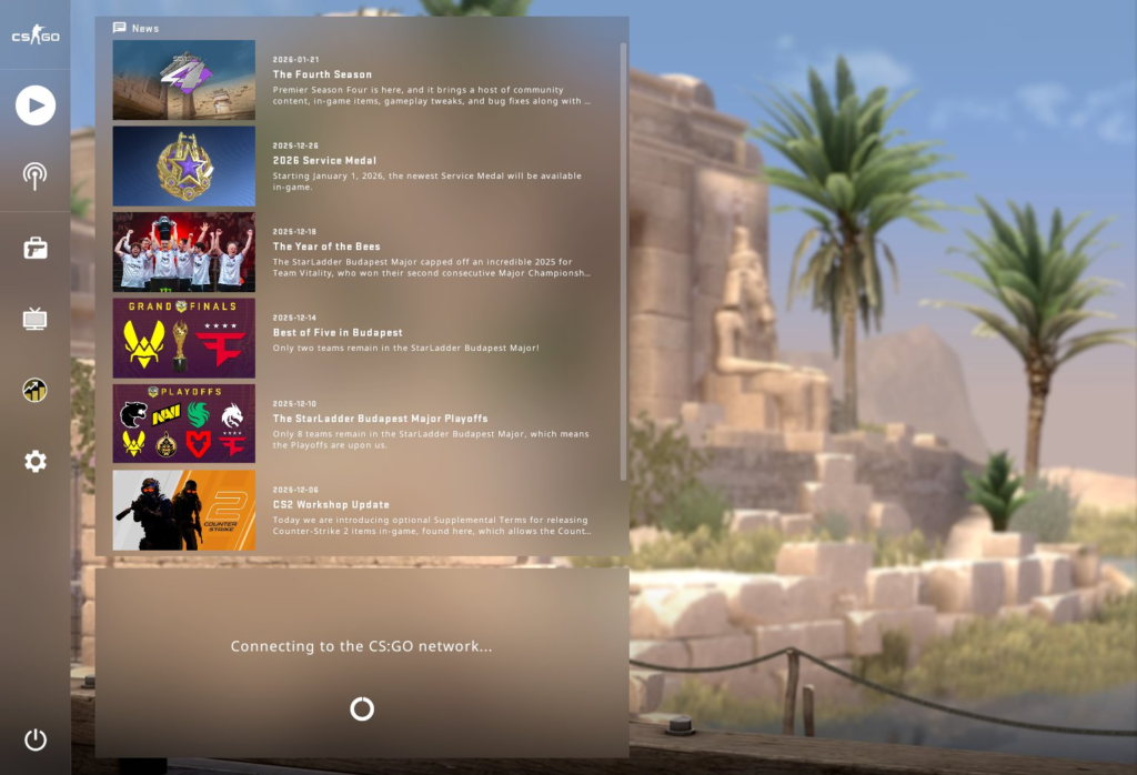 И на самом деле, когда мы запускаем Counter-Strike Global Offensive, через некоторое время мы попадаем в главное меню, которое не менялось с сентября 2023 года. К сожалению, сразу появится сообщение о подключении к сети Counter-Strike, поскольку Valve больше не поддерживает эту версию игры и официальные серверы там не работают. Тем не менее, вы можете, например, сыграть матч против команды ботов и вспомнить старую игровую механику. Хотим напомнить, что в CS:GO нам даже не пришлось уничтожать дымовые гранаты.