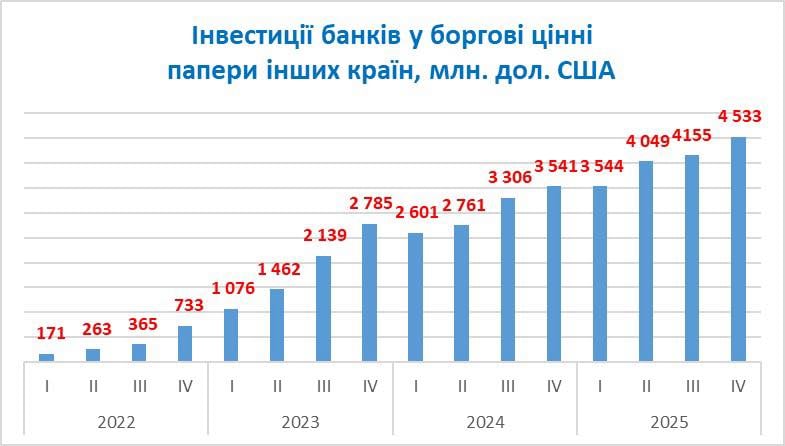По словам Данилишина, за последний год украинские банки вложили дополнительно $1 млрд в валютные облигации других стран. В настоящее время общий объем иностранных ценных бумаг на балансах украинских банков достиг $4,5 млрд.