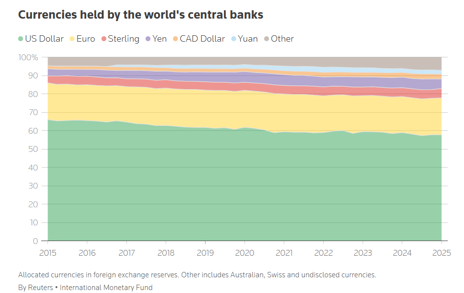 Доля доллара США в глобальных валютных резервах, сообщенных странами, международным валютным фонду немного снизилась на 0,1 стр. До 57,7% в первом квартале 2025 года. Доля резервов в евро увеличилась. Рейтер пишет об этом.