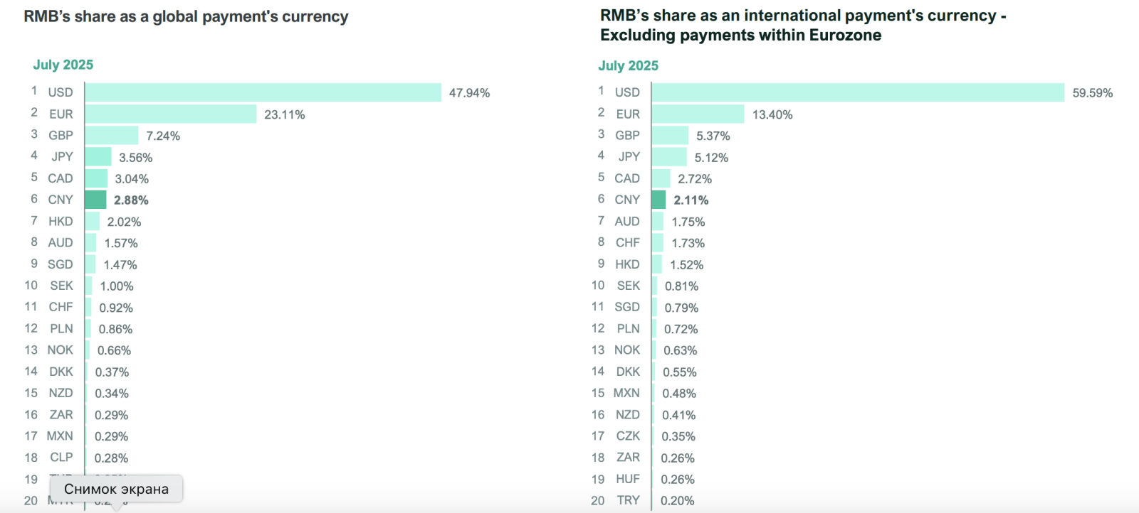 Евро оставался вторым, хотя его доля снизилась с 23,87% до 23,11% (-0,76 п.п.) и третий-британский фунт, что также сократило позицию (с 7,59% до 7,24%).