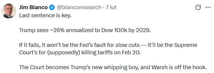 Известный аналитик Джим Бьянко, управляющий Bianco Research, отметил на платформе X, что Дональд Трамп уже готовит почву для возможного невыполнения этого обещания, указав на Верховный суд как на потенциального виновника. Если судьи ограничат таможенные полномочия президента, он может утверждать, что именно это решение предотвратило дальнейший бум.
