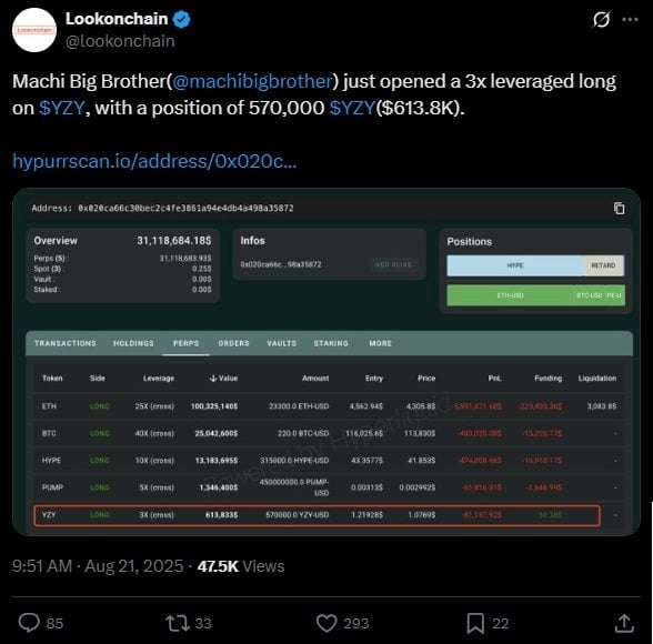 Эксперты на рынке криптовалют давно предупреждают, что это не простая отрасль. Высокая волатильность за короткое время является особенностью этого рынка. Мемоины особенно качаются. В этом случае наблюдатели указывают, что они тщательно подходят к новым проектам, в которых часто существует явление, называемое «насос и сброс» (насос и отказ). К сожалению, несмотря на многочисленные предупреждения и много информации, доступной по этому вопросу, люди все еще хотят вступить в такие проекты и терять состояние. Другой такой случай был широко прокомментирован в течение нескольких часов. Трейдер сосредоточился на токене Yzy, за которым стоит Канье Уэст, и потерял полмиллиона долларов за два часа.