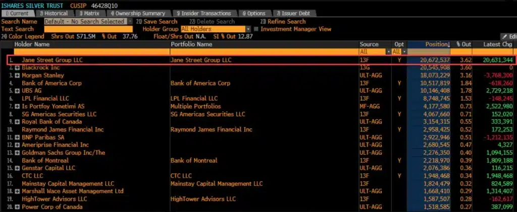 Однако на этом история не заканчивается. Джейн Стрит стала крупнейшим акционером ETF iShares Серебряный траст о тикере SLV. За один квартал компания приобрела рекордные 20,6 млн единиц, а общая стоимость ее позиций превысила $1,3 млрд. Для среднего инвестора это не является ни явным бычьим, ни медвежьим сигналом для цен на серебро.