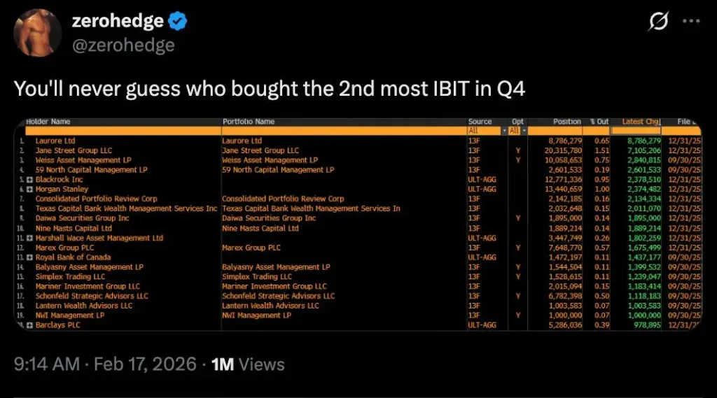В то же время аналитики следуют необычной стратегии Джейн Стрит по одновременной продаже Биткоина в критические моменты американской сессии… И агрессивно наращивают свои позиции в акциях Strategy, ранее MicroStrategy, возглавляемой Майклом Сэйлором. Эта компания, владеющая сотнями тысяч BTC, действует как косвенный инструмент воздействия на цену биткойнов. В четвертом квартале 2025 года Jane Street увеличила свою долю в MSTR на 473%. В то время другие крупные игроки рынка сокращали свое присутствие.
