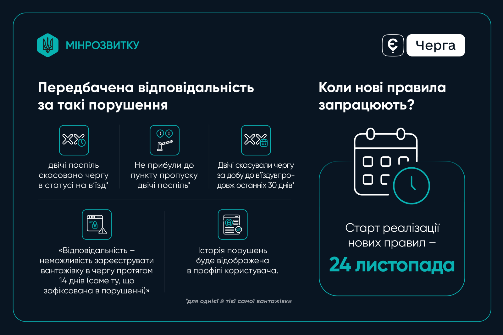 Министерство развития громад и территорий Украины объявило о начале поэтапного внедрения обновленных правил использования системы «еЧерга» для грузового транспорта. Новые правила, утвержденные приказом № 1028 от 20 июня 2025 года, вступят в силу 24 ноября.