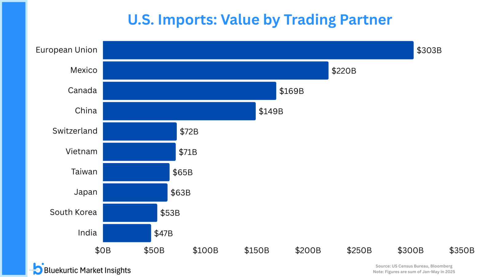 Возмущение Европы легко объяснимо цифрами. По данным Бюро переписи населения США и Bloomberg именно Европейский Союз является безоговорочным лидером среди всех партнеров Соединенных Штатов. Только за первые пять месяцев 2025 года объем европейского импорта в США составил колоссальные 303 миллиарда долларов.