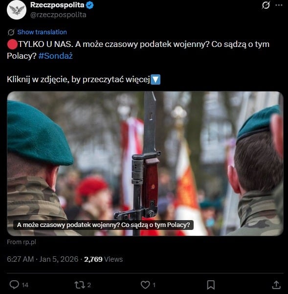 Оказывается, общество не поддерживает введение новых сборов, таких как временный военный налог. Rzeczpospolita представила результаты исследования, проведенного IBRiS. В рамках опроса, который компания провела в конце 2025 года, респондентам задали вопрос, поддерживают ли они из-за растущей угрозы со стороны России введение временного налога на оборону и военную модернизацию.