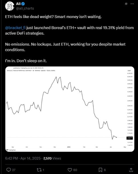 Таким образом, дискуссия о состоянии и в то же время вернулось будущее Ethereum. Али Мартинес один из его последних постов на X начался с вопроса: «Эт, кажется, мертвый балласт?«. Это спорное введение было использовано для информирования о новой компании, связанной с Binance. Однако вряд ли кто -то заметил сам проект. Дискуссия о форме и будущем ETH снова началась.