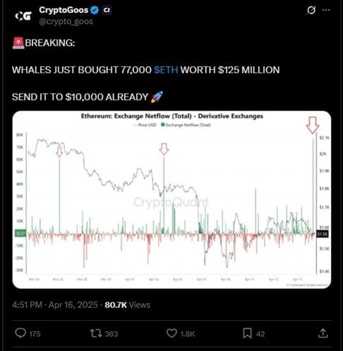 Согласно платформе Cryptogoos, киты недавно купили 77 000 штук Eth. Это также не число, которое может определить что -либо, но показывает, что они все еще готовы купить альткойн на рынке. Если эта группа увеличится, это шанс, что Ethereum будет защищать от снижения.