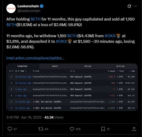 Это не транзакция, которая потрясет рынок, но аналитики отметили, что кит сильно потерял эту транзакцию. Потому что 11 месяцев назад, когда он купил Ethereum, Altcoin стоил 58% больше — 3816 долларов. Эксперты подсчитали, что это доказывает, что рынок испытывает все больше и больше продаж, и больше нет терпения, чтобы ждать отражения.