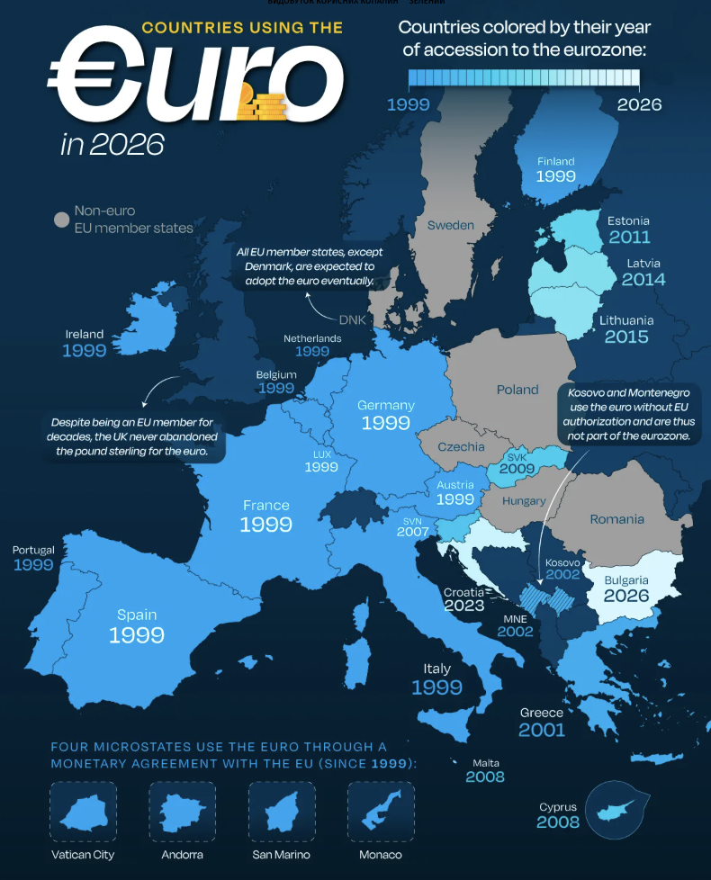 С момента своего введения в обращение в 1999 году евро распространилось на большую часть Европы, став одной из наиболее широко используемых валют в мире. Visualcapitalist показало, как еврозона расширилась с момента ее основания в 1999 году, используя официальную статистику Европейского Союза за 2026 год.