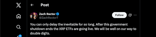 Финансовый аналитик Зак Ректор считает, что путь XRP к долгожданному двузначный диапазон это только вопрос времени. Он утверждает, что задержки в одобрении ETF, вызванные продолжающимся закрытием правительства США, являются просто временной паузой в ожидании притока крупных институциональных фондов.