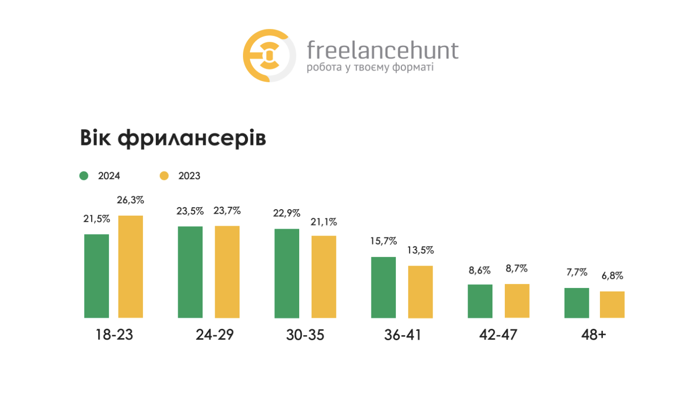 Согласно портрету Frilanzer 2024 от FreeLanceHunt, около 45% украинских фрилансеров 18-29 лет. Это поколение активно освоивает цифровые инструменты и интегрирует их в рабочие процессы.
