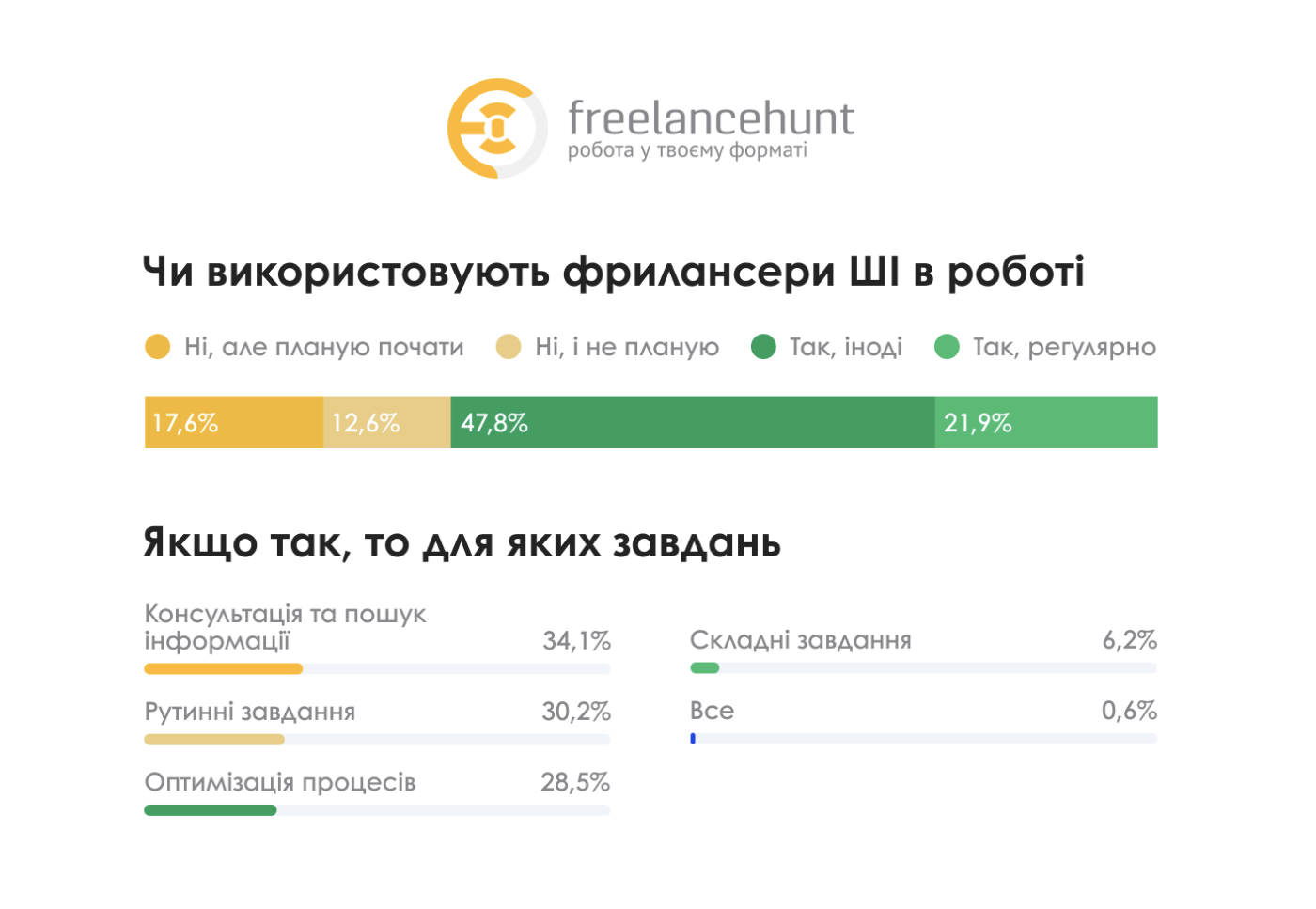 В частности, 69% украинских фрилансеров уже используют инструменты искусственного интеллекта (ИИ): 21,9% регулярно, 47,8% — периодически. Только 12,6% не планируют применять ИИ в своей работе.