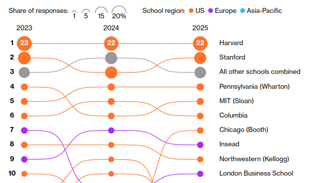 В опросе, который определяет наиболее желательную бизнес -школу, Гарвард уверенно обошел своих конкурентов.
