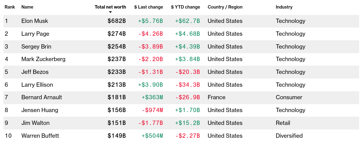 Илон Маск возглавляет список со значительным отрывом от ближайшего конкурента Ларри Пейджа.