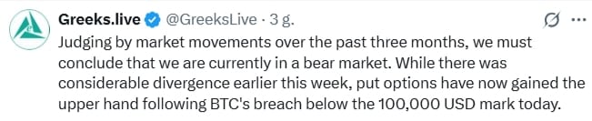 Адам Чу, главный исследователь аналитической платформы GrecsLive, заявил, что «Судя по движениям рынка за последние три месяца, мы должны сделать вывод, что в настоящее время мы находимся на медвежьем рынке». Он добавил, что, несмотря на наличие значительных расхождений в настроениях инвесторов, опционы помещать получил преимущество после того, как Биткойн преодолел уровень в 100 000 долларов США.
