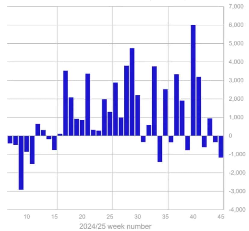 Согласно данным, опубликованным фирмой по управлению активами CoinShares, это негативное развитие событий во многом было вызвано сохраняющейся волатильностью после резкого «каскадного снижения ликвидности» 10 октября и неопределенностью вокруг потенциального снижения процентных ставок в Соединенных Штатах.