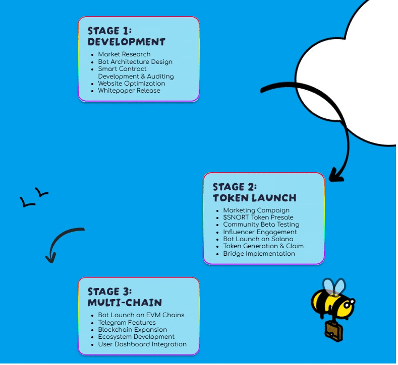 В настоящее время Snorter находится в г. второй этап дорожной картывключая бета-тестирование, сотрудничество с влиятельными лицами, запуск бота в сети Solana и внедрение межцепочного моста ликвидности. Следующий этап предполагает введение панель пользователя с аналитическими инструментами, статистикой производительности и опциями ставок.