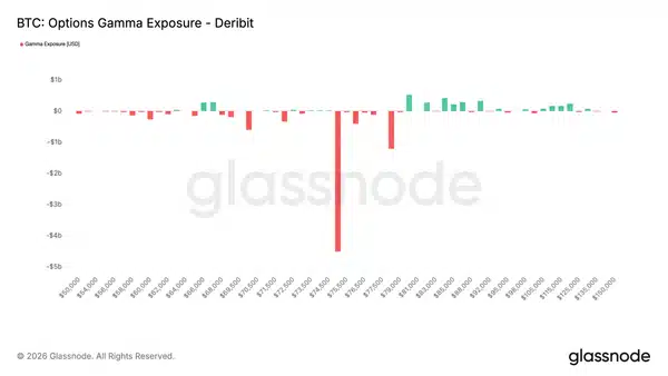 Одним из ключевых показателей, на который следует обратить внимание, является подверженность дилеров гамма-излучению. На рынке, работающем с низкими объемами, потоки хеджирования дилеров могут перемещать цену к определенным уровням (называемым страйками), которые действуют как магниты. На данный момент единственный значимый уровень – 75 тысяч. долларов США, где сосредоточено около 4,5 млрд долларов США отрицательной гамма.