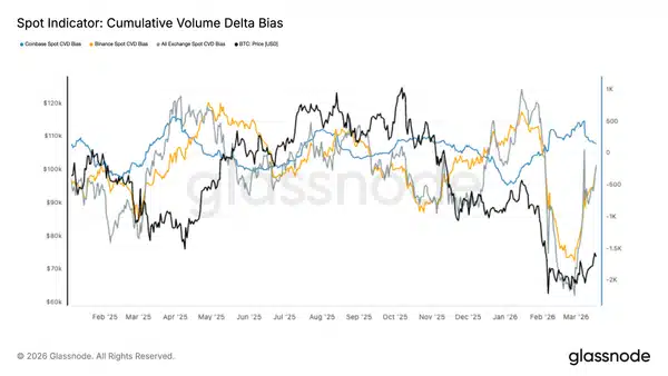 Совокупная дельта объема (CVD) на спотовом рынке резко выросла на основных биржах после длительного периода доминирования продаж. Сильный отрицательный дисбаланс, наблюдавшийся во время недавнего падения, особенно на Binance, начинает меняться, сигнализируя о возвращении преимущества покупателя.