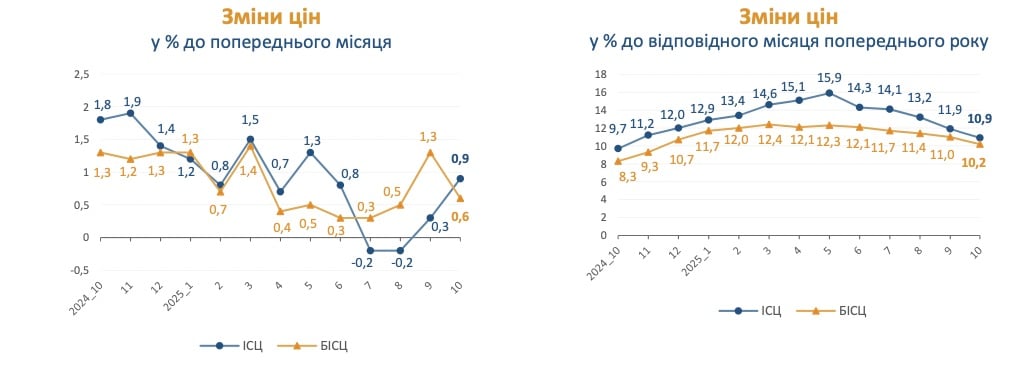 Инфляция на потребительском рынке в октябре 2025 года по сравнению с сентябрем составила 0,9%, с октября 2024 года — 10,9%. Базовая инфляция в октябре 2025 года по сравнению с сентябрем составила 0,6%, с октября 2024 года — 10,2%. Об этом говорится в данных Государственной службы статистики.