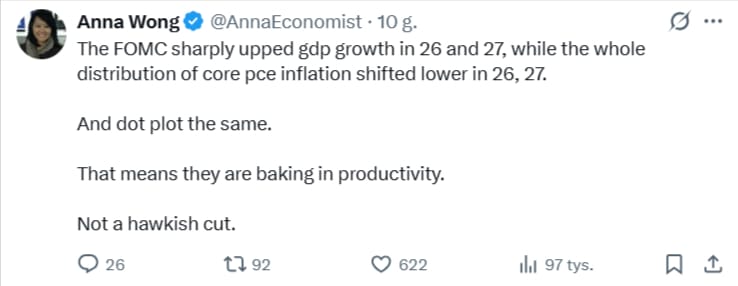 До заявления FOMC инвесторы опасались «ястребиного снижения», которое поставит под вопрос дальнейшее смягчение политики. Мягкая позиция ФРС обычно позитивна для золота, поскольку драгоценный металл растет в условиях более низких процентных ставок. Председатель ФРС Джером Пауэлл после заседания предположил, что ФРС уже сделала достаточно для поддержки занятости, сохраняя при этом процентные ставки достаточно высокими, чтобы продолжать оказывать давление на ценовое давление. Тем не менее, инвесторы сохранили ставку на еще два сокращения в 2026 году, причем еще одно снижение на четверть пункта запланировано на июнь. Центральный банк США прогнозирует снижение ставки на одну четверть пункта на весь 2026 год, что осталось неизменным по сравнению с сентябрьским прогнозом.