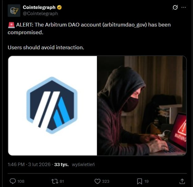 Сегодня, во вторник днем, 3 февраля, был захвачен официальный управляющий аккаунт Arbitrum DAO на платформе X.. Это заставило команду немедленно выдать пользователям предупреждение о безопасности.. На данный момент сам протокол Arbitrum и его смарт-контракты не были скомпрометированы. Инцидент вызвал серьезную обеспокоенность по поводу фишинга, попыток вымогательства и структурных недостатков в коммуникациях в экосистемах Web3.. Последние месяцы были полны сообщений о деятельности киберпреступников. Мы уделяем еще больше внимания тому, чтобы пользователи блокчейна были осторожны и не доверяли… Даже официальным объявлениям без их окончательной проверки.