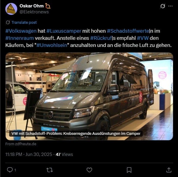 ZDF Television определил, что крыши в VW Grand California до мая 2022 года испускали вещества в сумме, превышающей допустимые нормы внутри автомобиля. Как внутренние стандарты Volkswagen, так и нормы Федерального агентства по охране окружающей среды Германии.