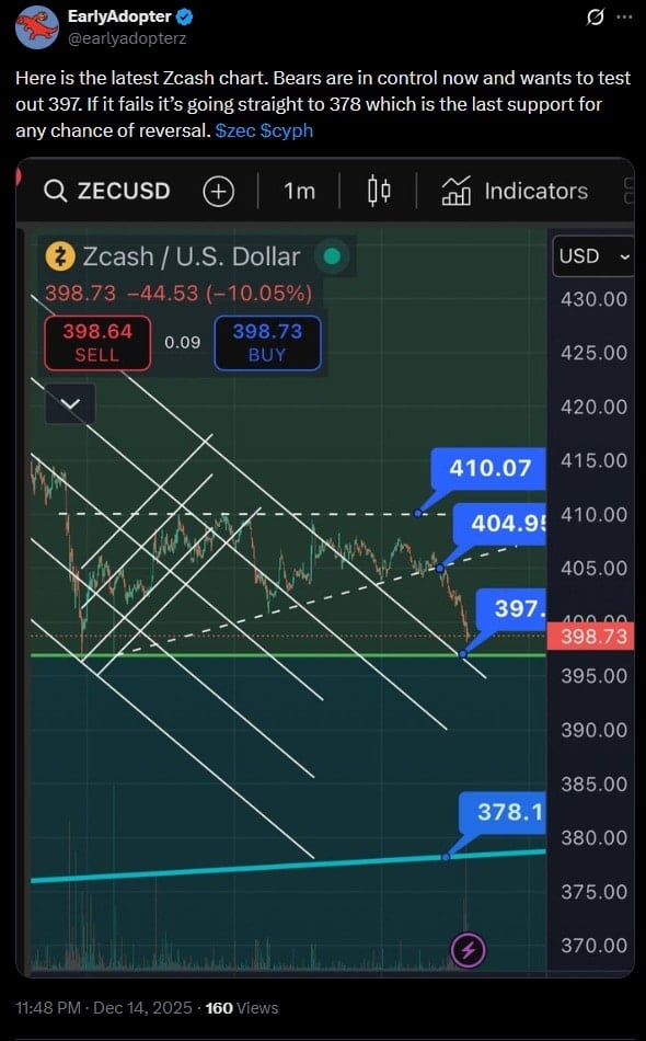 Его крупнейший конкурент, Monero, также слабеет, но по-прежнему сохраняет позиции лидера в секторе токенов конфиденциальности. На момент написания Monero (XMR) торгуется по цене 407 долларов.