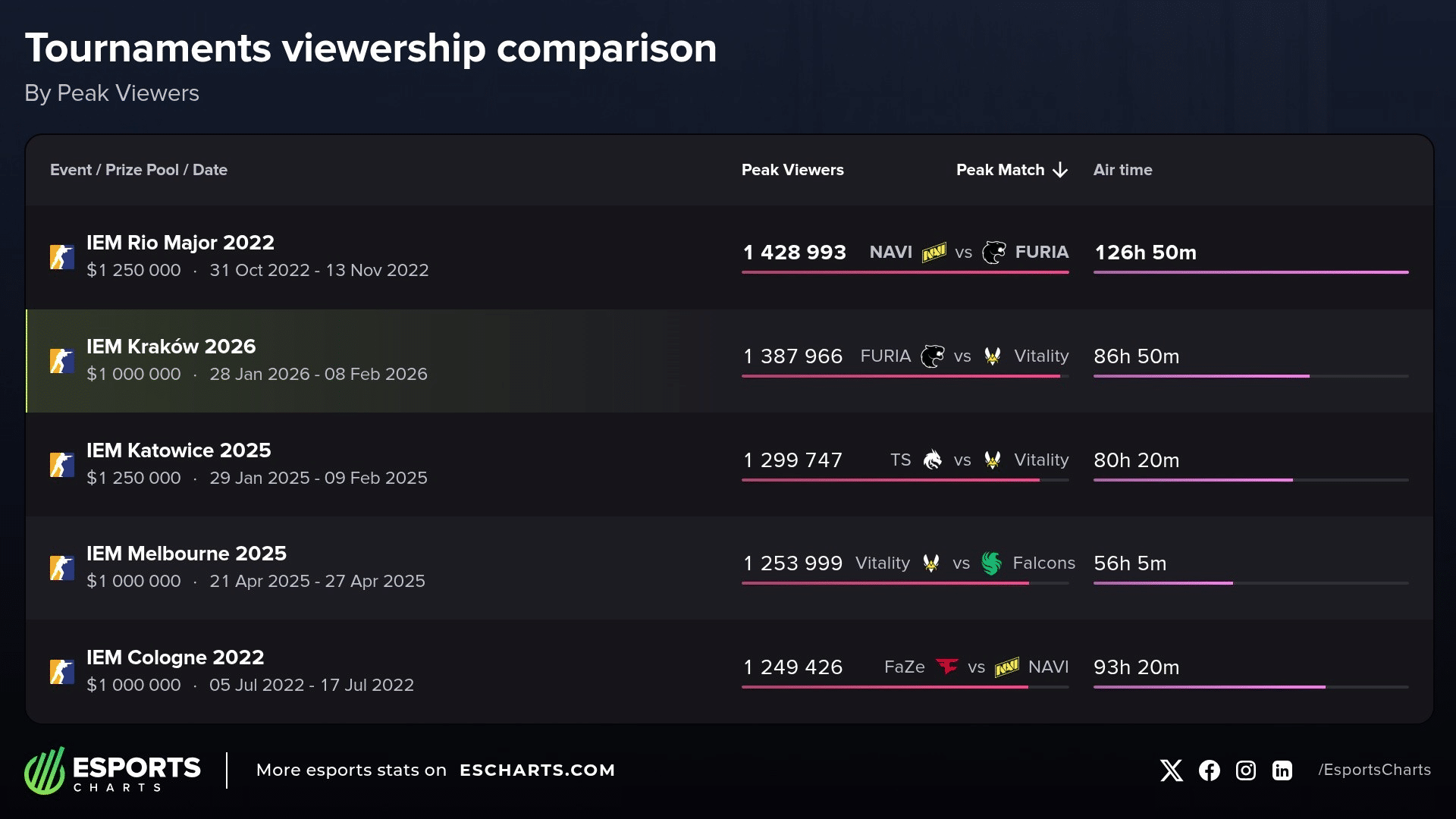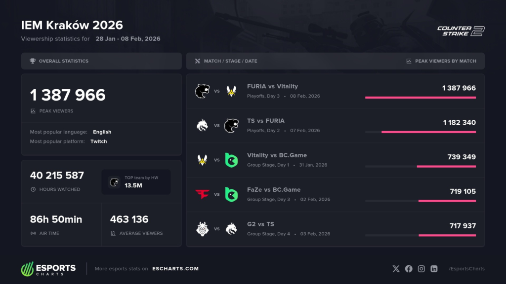 Профиль Esports Charts в Твиттере, где публикуются диаграммы просмотров почти всех киберспортивных турниров, объявил, что IEM Kraków установил новый польский рекорд. Как мы видим, турнир на Таурон Арене стал самым популярным турниром на польской земле в истории. На пике просмотра, во время гранд-финала между FURIA и Team Vitality, трансляцию посмотрело более миллиона трехсот восьмидесяти тысяч зрителей. Это абсолютный рекорд в истории турниров, проводимых в Польше, а IEM Kraków обогнал нынешнего лидера Intel Extreme Masters Katowice 2025 почти на 90 000 зрителей.