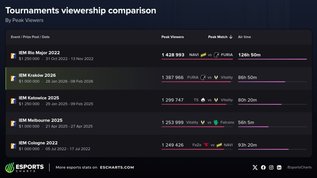 IEM Kraków 2026 также стал восьмым по популярности турниром по Counter-Strike в истории и самым популярным некрупным турниром. Соревнования на Таурон Арене, среди прочего, привлекли больше зрителей. ELEAGUE Major Boston 2017 или Perfect World Major Shanghai 2024. Кроме того, турнир в Кракове стал вторым турниром, организованным ESL, уступив только IEM Major Rio 2022.