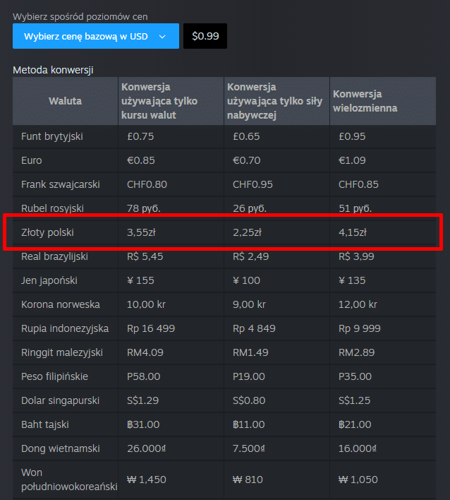Отныне в Steam будет три способа расчета цен для Польши, и решение использовать любой из них остается за разработчиками. Один из них — предыдущий, который, вероятно, никому не нужен. Второй — 1 доллар США = 3,55 злотых, что очень близко к текущему курсу доллара, а третий — это так называемая «конвертация с использованием покупательной способности», и в этом случае 1 доллар равен 2,25 злотых.