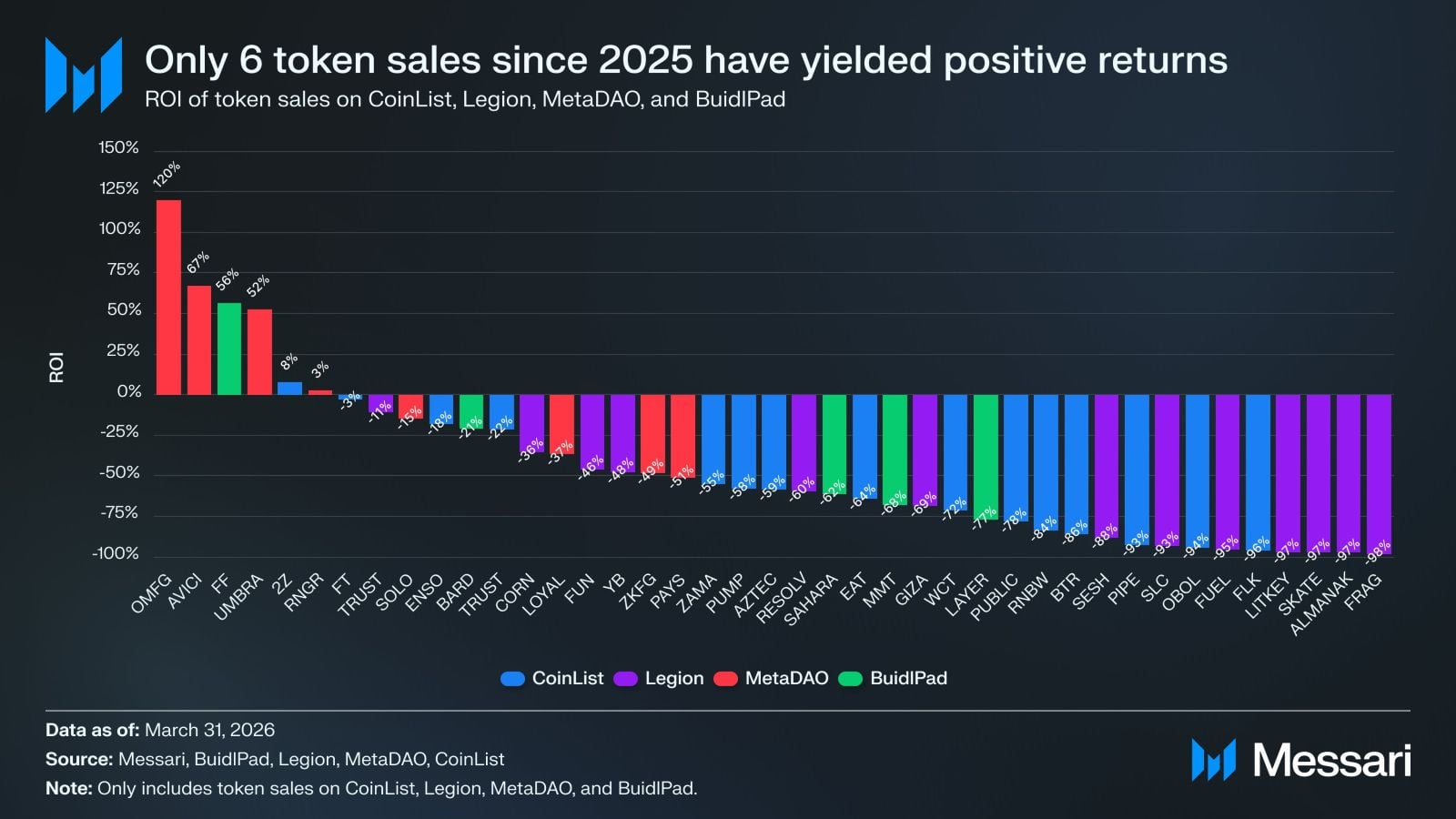 Индустрия криптовалютных токенсейлов сталкивается с жесткой реальностью обрушения оценок и дефицитом ликвидности. Инвесторы, надеявшиеся на традиционные для крипторынка сверхприбыли от участия в ранних размещениях на ключевых площадках, массово фиксируют убытки, кое-где достигающие почти 100%. Такую аналитику представили на платформе Messari.