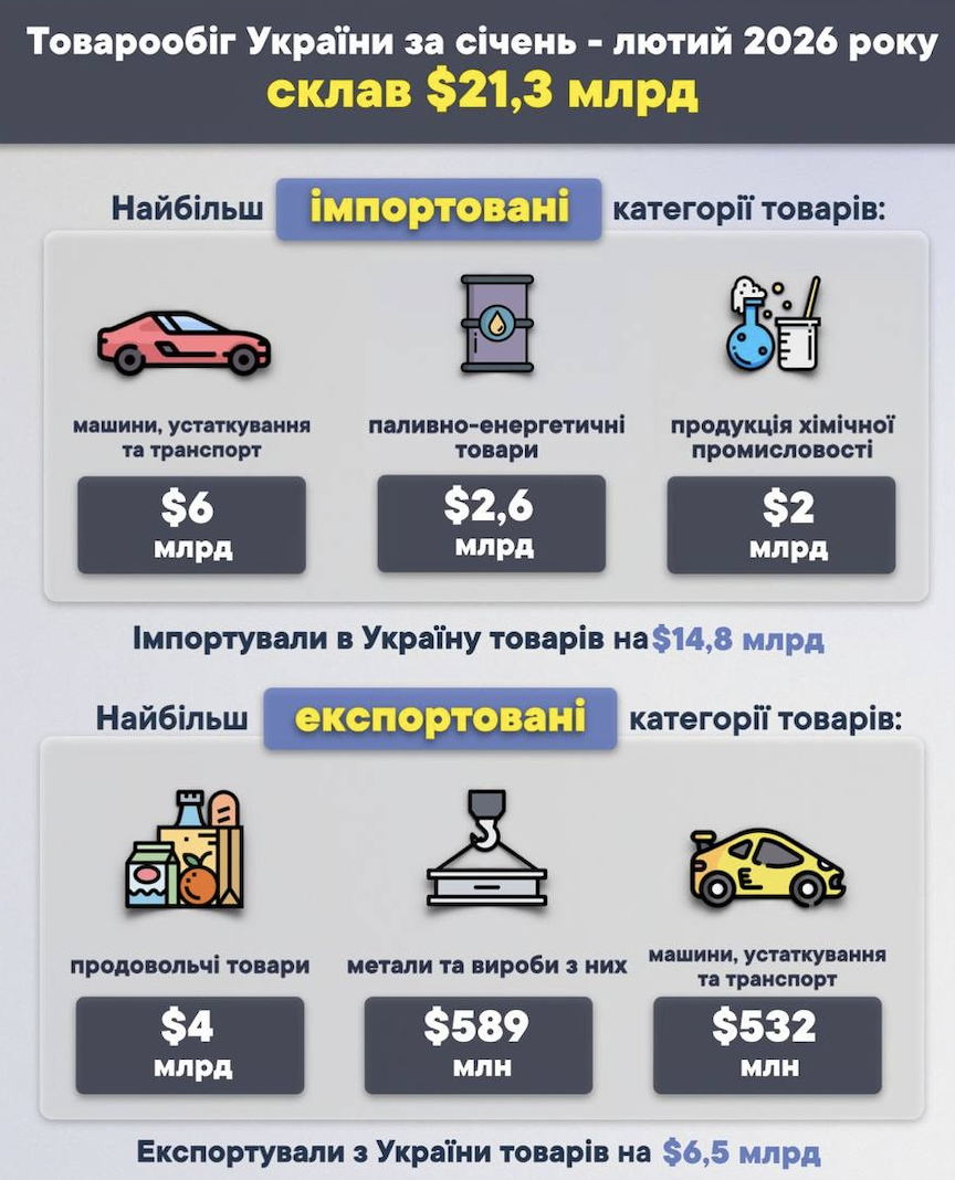 В январе-феврале 2026 года Украина импортировала товаров на $14,8 млрд, тогда как экспорт составил лишь $6,5 млрд. При этом облагаемый налогом импорт составил $5,2 млрд, или 78% общего объема импортируемых товаров. Об этом написала народный депутат Нина Южанина.