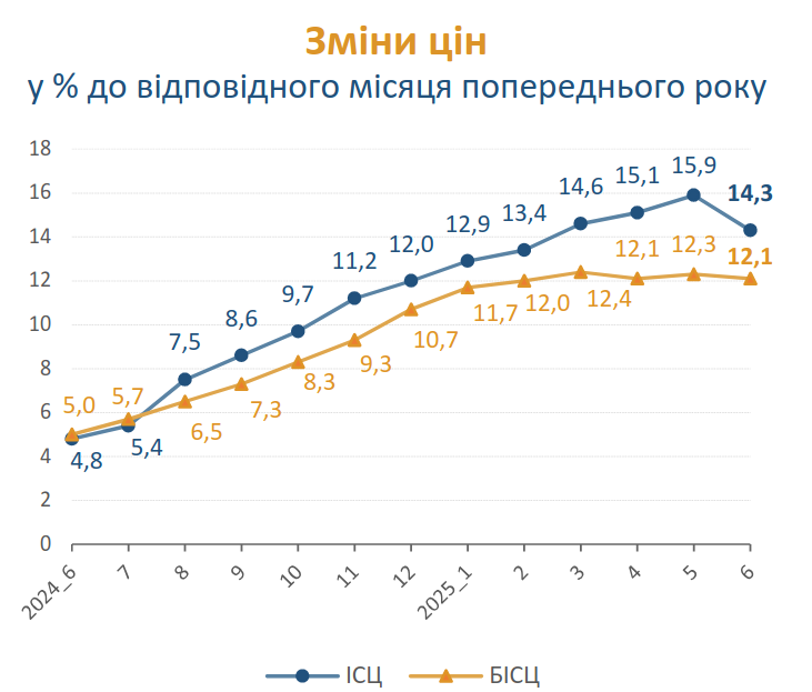 В июне 2025 года потребительские цены в Украине замедлились. Годовая инфляция (по сравнению с июнем 2024 года) составила 14,3%и ежемесячно (по сравнению с май 2025) -0,8%. В среду, 9 июля, сообщила Служба статистики штата Украина.